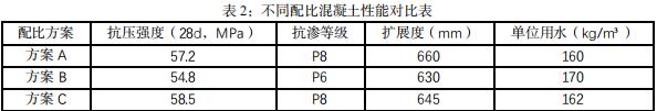 项目团队设置三组混凝土配比方案,对不同矿粉掺量与外加剂比例组合进行性能对比试验,试件使用 150mm 标准立方体进行 28 天抗压强度测试,抗渗等级以六面加压法测定 P 值,流动性由扩展度和 L 型箱泵送模拟双重验证[5]。三组方案中方案 A 水胶比控制严格,矿物掺合料反应活性保持在中等水平,单位用水 10kg,强度表现稳定,方案 B 提高用水量,掺合料比例偏低,扩展度虽高但抗渗性能下降,方案 C 在矿粉与粉煤灰比值基础上优化外加剂掺量,扩展度与抗压指标均衡,施工窗口内保持性能稳定。下表 2 展示了具体信息。