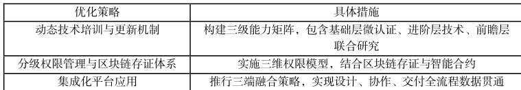 信息化技术驱动下,设计端使用 API 接口将 Revit、Rhino 等建模工具与云端平台进行联动,例如某设计团队将参数化幕墙模型接入集成平台后,需对立面曲率参数进行调整,平台自动触发结构计算、能耗模拟及成本估算模块,使方案优化周期得到压缩。协作端建立跨专业数据舱,将建筑、机电、景观等模型转化为轻量化数据包,支持施工方凭借移动端 AR 扫描现场直接比对设计数据,某商业综合体项目对管线碰撞隐患问题及时发现,降低损失。交付端将 BIM 模型与运维系统对接,运维人员扫码即可获取设备参数、维修记录及备件库存,使故障响应效率得到提升。信息化技术在建筑设计管理中的优化策略如表 1 所示: