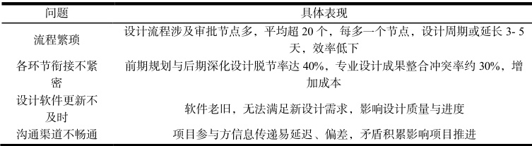 新形势下,从流程来看,项目从前期调研到方案确定,再到初步设计与施工图设计,涉及审批、反馈与修改等环节,手续繁杂且重复工作多,导致设计周期长,效率低下。流程繁琐,从项目立项到设计完成,平均涉及 20 余个审批节点,每增加一个节点,设计周期将延长 3 天-5 天。各环节衔接不紧密,设计前期规划与后期深化设计常出现脱节情况,导致设计变更频繁。例如,在方案调整时,需经过多个部门审核,流程冗长。在各环节衔接方面,设计前期规划与后期深化设计脱节,前期未充分考虑施工可行性,后期施工时方发现设计问题,引发设计变更。不同专业设计人员间沟通不足,专业设计成果整合困难,影响设计整体质量与项目推进,为工程建设带来隐患[2]。