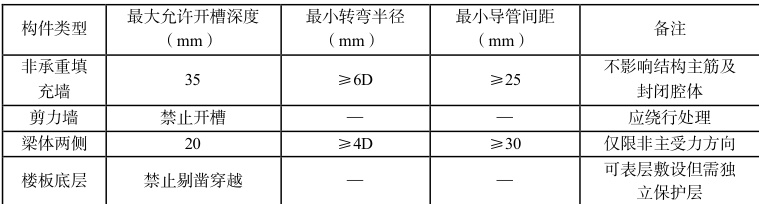 电气管线暗敷设过程中的开槽路径应严格限定在结构许可区域内,满足电气功能定位与结构完整性双重要求,确保槽位位置、深度、走向与建筑电气系统统一协调[1]。导管开槽宽度需大于管道外径1.5 倍,回填后形成密实保护壳体,防止导管外壁与水泥砂浆脱粘;开槽深度应限制在墙体总厚度的30% 以内,当墙厚小于 120mm 时不应超过 35mm ,否则将削弱承载截面引起结构局部应力突变。槽线走向应采取水平或垂直两种方式,不得斜向穿行,交汇部位需留足弯曲半径空间,转弯半径 R 应满足公式 R⩾ 6D ,其中 D 为导管外径( 'mm ),以避免热胀冷缩状态下管道在槽角受力集中导致壁裂或接口失效。墙面开槽后管位必须远离已有钢筋构件,钢筋扫描应覆盖完整走向长度,并记录扫描图层数据,确保槽线位置不干扰主结构骨架。水平布线应自下而上依次分层,强电主干线沿地面通道布设,分支弱电线管可向上开槽至开关、插座、照明位置,导管间最小间距不得小于 25mm⨀ 对墙体、梁体、柱体的开槽布设允许参数详见表 1,数据按常规砖混结构与混凝土框架建筑典型值进行确定:
