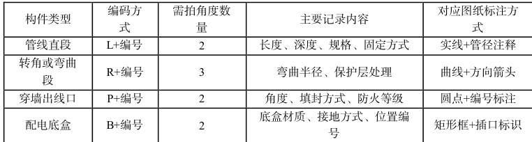 电气暗敷管线工程属于典型隐蔽工程类别,需在不可逆施工节点前形成完整过程记录体系,用以支撑后期验收合规性与质量追溯精度[3]。记录方法以时间序列为轴,结合构件编码与图纸定位建立双重索引机制,确保信息可检索、图档可对照。每段导管布设完成后需现场拍摄影像资料,拍摄角度应覆盖槽位全长、接口节点与开关插座底盒位置,影像图像需附带比例尺标定与编码标签。导管、底盒、穿墙口等关键节点应单独编号,编号规则应依据系统分类设定,如 A1 代表强电主干线,W2 代表弱电语音管线,统一归入隐蔽工程分项台账中。所有拍摄资料需按《建筑工程施工质量验收统一标准》要求生成隐蔽验收表格与影像存档,影像分辨率不低于 300dpi,存储格式限定为 PDF 与原始图像双版本归档。槽体开设长度、深度及导管规格参数应填写在隐蔽记录表中,施工单位需在封槽前与监理单位双签确认数据一致性与实物一致性。为满足验收精准记录要求,应引入导管埋设路径长度计算公式L = ටቀΔxቁଶ+ ቀΔyቁଶ+ ቀΔzቁଶ,单位为 mm,用以记录空间立体路径走向的真实物理长度,便于后续检修定位与材料量核查。