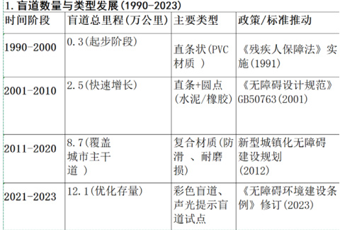 盲道是盲障人士出行重要引导标识。近年来,如图片 2 所示,各地加大盲道铺设力度,城市主要道路人行道基本按规划设置盲道。盲道由条形引导砖和圆点提示砖构成,前者引导盲人前行,后者提示关键信息。同时,公共交通系统无障碍设施持续完善。如广州地铁,每站均设2 个以上无障碍电梯、1 个无障碍坡道、1 个第三卫生间、12 个盲文站牌,还有无障碍检票专用通道,列车车厢内配备无障碍轮椅位;部分城市公交车配备低地板或可升降踏板,方便盲障人士上下车,车内设有专门扶手和语音报站系统,为盲障人士出行提供便利。