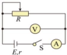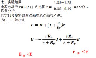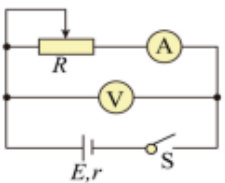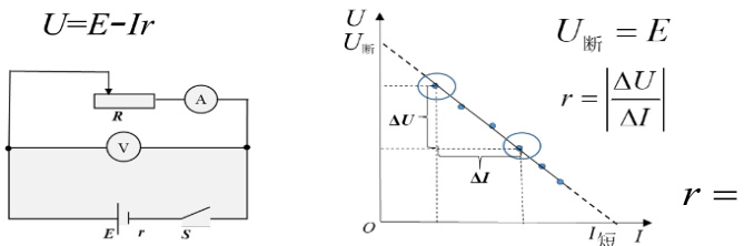 根据闭合电路欧姆定律,电源的路端电压。在如图所示的电路中,改变R的阻值,从电压表和电流表中读出几组I、U 值,用作图法来处理数据。即在坐标纸上以I 为横坐标,U 为纵坐标,用测出的几组I、U 值画出U -I 图象(如图所示)。所得直线跟纵轴的交点即为E, 图线斜率的绝对值也为 r