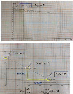 纵轴交点值代表断路电压等于 E=1.45v ,因为电压差值所对应的电流差值并没发生变化,所以斜率并没有改变,即电动势和内阻值也不会发生变化。