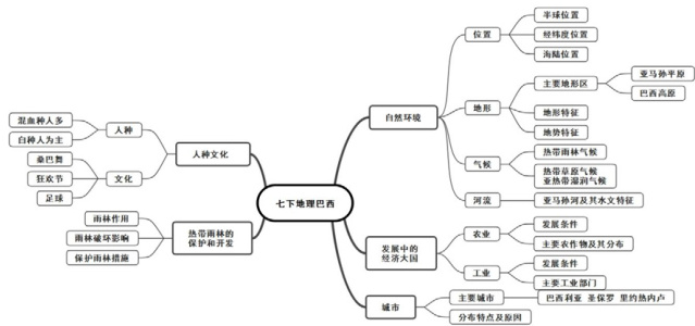 例如:在对学生进行人教版七年级(下)“巴西”这一部分知识内容教学时,教师可采用思维导图这一方式进行教学活动开展。以巴西为中心主干,向外延伸出自然环境、发展中的经济大国以及人种和文化、城市及热带雨林开发与保护五个主分支,然后再对主分支继续细化,分出位置、地形、气候、农业、工业、城市以及人种文化和雨林作用、破坏影响与保护措施等多个分支,具体如下图所示: