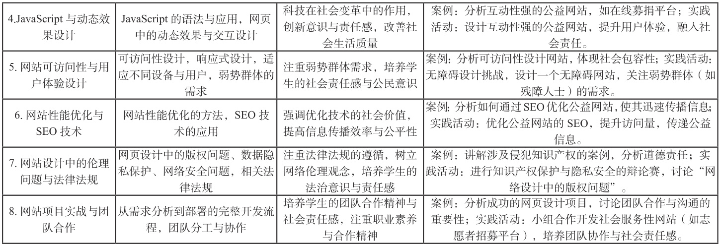 通过在《网页设计与制作》课程中融入思政元素,可以帮助学生在掌握专业技能的同时,树立正确的世界观、人生观和价值观。课程思政的引入,使学生不仅仅是技术的传递者,还是社会责任的担当者。此外,思政教育的融入也能够提升学生的创新意识,促使他们在未来的职业生涯中,能够主动承担起社会责任,为社会发展贡献力量。
