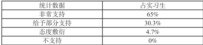 幼儿园在对待实习生的教育实习工作支持程度上。通过调查分析了解到, 83% 的学生认为幼儿园领导对待实习生工作是非常支持的,有11% 的学生认为幼儿园领导对待实习生工作顺其自然,正常的完成工作,也有 6% 学生认为幼儿园领导对待实习生工作是消极的。