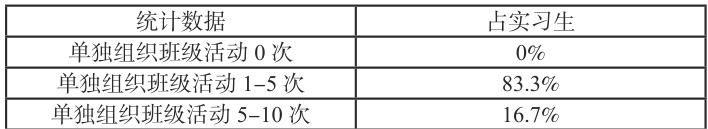 可见,所有的实习生都参与了带班实践体验工作,实习生对带班实践工作的参与度上很高。在带班工作中,主要是对幼儿的日常管理、组织、或安排班级活动。在“你单独组织班会的次数”问题中,占人数总比 83.3% 的实习生均有 1-5 次的班级管理。见(表4)