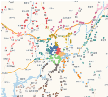 本文以湖北省黄冈市烟草配送中心农网配送区域为作为案例,基于其历史订单,评估本文提出的区域划分与路径协同优化算法的效果。为构建准确的地理空间模型,本文通过高德地图开放API 获取各配送点之间的实际行驶距离与时间。各客户的配送需求量参考黄冈市烟草公司2024 年4 月至6 月的历史销售记录。