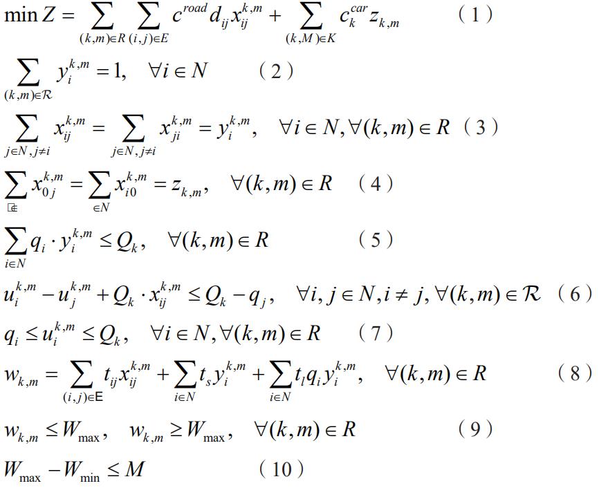 表示所有车辆组成的集合; di,j 表示车辆从 i 到 j 所需的行驶距离; ti,j 表示车辆从 i 到 j 所需的行驶时间; qi 表示客户 i 的需求量; Qk 表示类型 k 的车辆的最大装载量; ts 表示到达客户点后因装卸等操作造成的停留服务时间; tι 表示从配送中心出发前平均每单位货物的装载时间;xi,jk,m 为0-1 变量,表示车辆 (k,m) 是否从 i 行驶到 j ; yik,m 为 0-1 变量,表示车辆 (k,m) 服务; zk,m 表示车辆 (k,m) 是否被使用; uik,m 表示到达客户 i 时车辆 (k,m) 的累计载重; Wk,m 表示车辆 (k,m) 的工作量; croad 表示单位配送距离的成本; ccar 表示车辆使用成本。