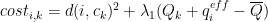 代价函数中,第一部分是空间紧凑项,表示客户 i 到聚类中心 ck 的欧式距离平方;第二部分是簇内负载均衡性项,表示客户 i 加入后,簇 k 的总负载与理论平均负载