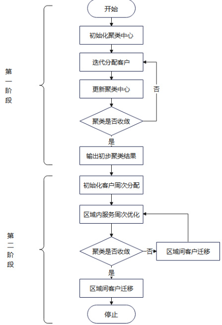 算法分两个阶段执行,第一阶段通过带约束的 K-means 算法构造结合区域装载与客户数控制的配送区域划分,第二阶段在各区域内进行两周一送客户周期归属与装载微调,实现区域结构稳定性与周期负荷平衡性的协同优化。