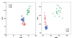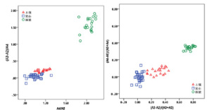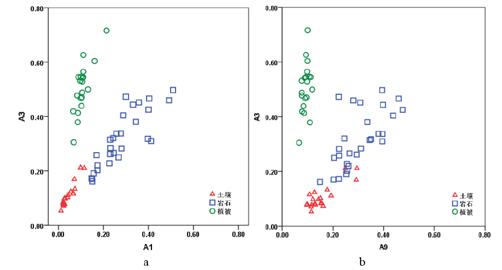 A1 与 A2 波段的散点图中,三类地物点群也有较明显的分界线。A1 与 A4、A5、A6、A7、A8、A9 波段组成的二维散点图中,三类地物点群边界有相互重叠现象,分界不明显,这些波段组成的二维光谱空间不利于进行地物的分类识别。
