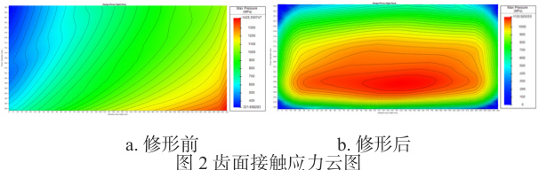 本文以某机型高速级齿轮副为研究对象,考虑轴承、箱体刚度的影响,利用 MASTA 软件对整机进行仿真分析,计算齿面接触应力如图 2 所示。由图 2 可知,修形后齿面接触应力由 1425.35MPa 降至 1130.93MPa,降幅为20.65% ,齿面应力分布更加均匀,齿面偏载现象基本消除。