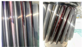 在额定转速下施加 100% 额定载荷进行试验,试验结果如图 5 所示。通过观察输入齿轮和输出齿轮的接触斑点,整个齿面在齿宽方向上接触均匀,没有出现偏载的情况。通过试验证明高速级齿轮修形的方案效果比较好,修形方案合适。