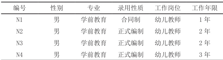 本研究以半结构式访谈作为收集数据的方法,预先根据理论文献及实践经验拟订了访谈提纲,随后抽取 1 名受访者进行预访谈,并参考预访谈结果对提纲进行调整。正式访谈前,研究者已将调整后的访谈提纲以文本的形式提前发送至受访者,以便让受访者有所准备;访谈内容主要围绕专业能力、组织文化、人际关系、心理认同四个板块,发掘男幼师入职初期教师职业适应困境。研究采用目的性抽样法,选取浙江省内 4 所幼儿园 4 名男幼师作为研究对象(见表1)。
