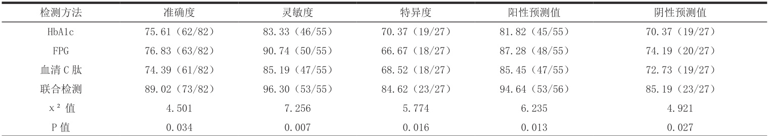 2.1 血清 C 肽、HbA1c 和 FPG 单一及联合检测对 DM 的诊断结果