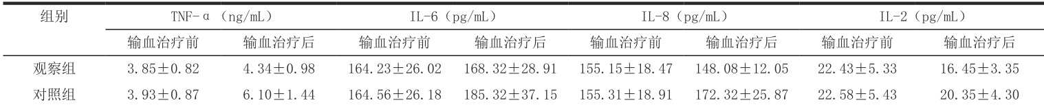 1.3.1 炎性因子变化:通过酶联免疫吸附法(ELISA)测定两组患者输血治疗前后炎性因子的水平,包括肿瘤坏死因子(TNF-α)、白细胞介素 -6(IL-6)、白细胞介素 -8(IL-8)、白细胞介素-2(IL-2)。