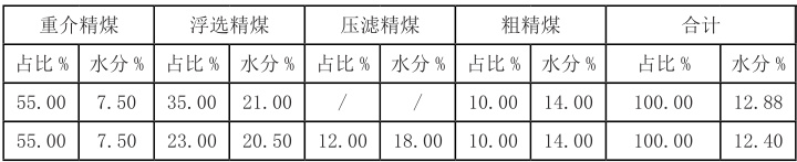 潘一选煤厂精煤产品主要由重介精煤、粗精煤和浮选精煤组成,其比例分别约为 55%,10% 和 35% 。精煤压滤投入使用前,三个产品水分分别在 7.5% 左右、14% 左右、 21% 左右,计算精煤产品水分为 12.88%00 。