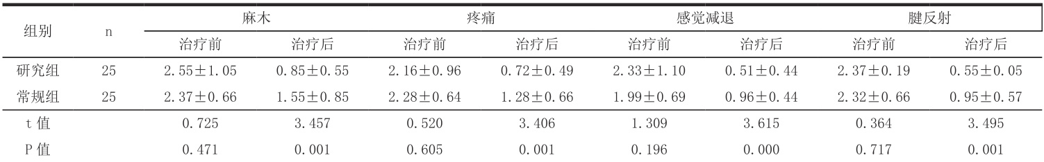收录研究对象的时间范围制定为 2023 年 11 月至 2024 年 11 月,样本对象制定为 50 例糖尿病周围神经病变患者,利用电脑抽号法的形式分组,以研究组、常规组作为两组的命名,各 25 例。研究组患者中,男性患者的例数为 13例,女性患者的例数为12 例,年龄范围如下:56\~84 岁,均值( 71.23±1.57 )岁。常规组患者中,男性患者的例数为 14 例,女性患者的例数为 11 例,年龄范围如下:57\~83 岁,均值( 71.22±1.55 )岁。两组患者的一般资料对比无意义(p