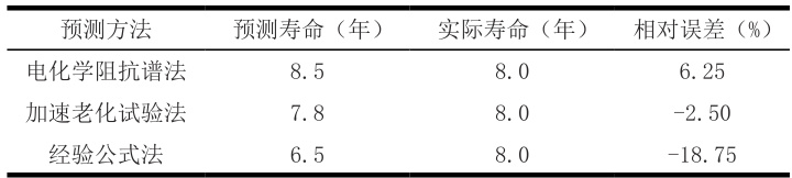 为了比较不同寿命预测方法的性能,选取某桥梁钢结构防腐涂层进行试验,分别采用电化学阻抗谱法、加速老化试验法、经验公式法进行寿命预测,并与实际使用寿命对比,结果如下表所示。