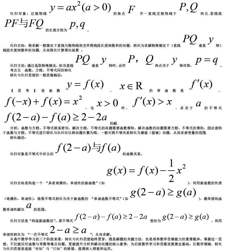 这三个阶段层层递进,基础阶段是前提,深化阶段是关键,综合阶段是升华,环环相扣,共同构成高中数学的学习体系。在高中数学中,函数学习中数学思想的应用是综合解题的关键,其中包括变量与对应思想、建模思想(构建函数关系)、利用函数性质分析问题、数形结合思想(函数图像的应用)、转化与化归思想(函数视角下的问题转化)、分类讨论思想(函数参数的动态分析)等。本文将重点探讨转化与化归思想。