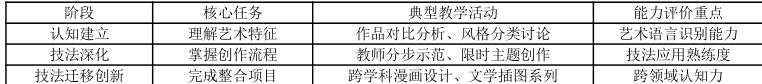 漫画插画课程地图的设计逻辑,本质上是以人文艺术素养为核心,串联知识、技能、表达的三维发展线索。其成功实施需依托三方面支持:学科边界的消融(将漫画作为科学、文学及艺术的表达载体),教学共同体的形成(教师、艺术家、学生协同创作),以及社会文化资源的活化(链接本地艺术场馆、行业赛事、非遗活动等)。未来研究可进一步探索人工智能在个性化创作辅导中的应用,唯有如此,才能实现“举一反三”的教育境界,使漫画插画从技法训练升华为认知世界的视觉艺术语言。
