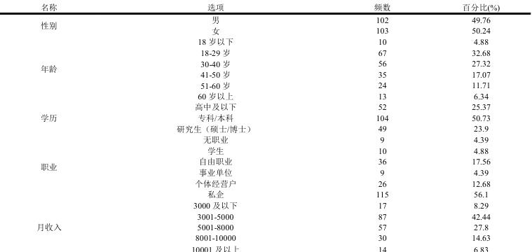 本研究中政策支持修改采用母娜(2025)的量表,选取 4 个题项。感知有用性修改采用赵森(2022)、刘婉秋(2024)、胡昕豫(2022)的量表,选取 3 个题项。感知易用性修改采用赵森(2022)的量表。感知娱乐性修改采用赵森(2022)的量表,选取 3 个题项,态度倾向修改采用许昕翔(2025)的量表;主观规范修改采用闫冰倩(2025)的量表,选取 3 个题项。消费者创新修改采用代瑜平(2022)的量表,选取 3 个题项。社会临场感修改采用(李芳轩和彭程,2025)的量表,选取 3 个题项。行为意愿修改采用代瑜平(2022)的量表,选取 3个题项。本研究问卷通过线上渠道共发放220 份,共收回有效问卷206 份,有效率约为 94%。