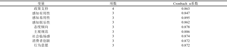 由上表可知,所有变量的信度系数表现均大于 0.7 属于高信度水平。