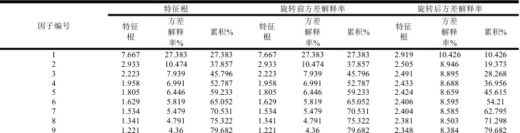 从上表可知:因子分析一共提取出9 个因子,特征根值均大于1,此 9 个因子旋转后的累积方差解释率为79.682%,说明量表有较好的解释力
