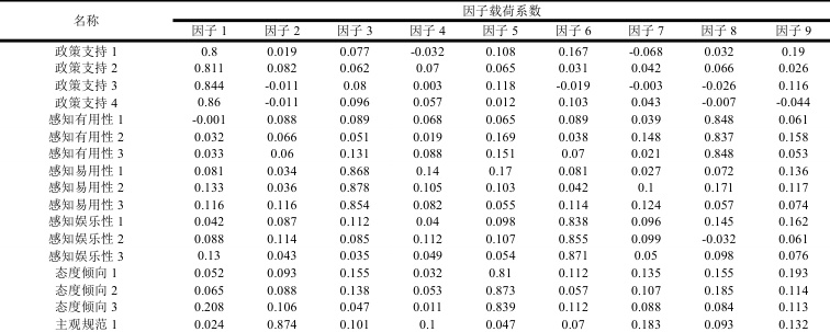 由上表可知,量表总体总计提取出9 个因子,标蓝的因子载荷系数均大于0.4,说明各题项能较好收敛于各个变量。因此问卷量表的结构效度检验合格。