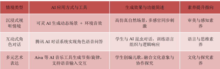 随后,教师提出游戏任务:“如果我们为小蚂蚁们配上一首歌,它们行走的节奏会是什么样的?”学生可通过语音输入或选择预制节奏模块,使用 Amper Music 等 AI 编曲工具,实时生成匹配的轻快儿歌节奏。学生以小组为单位尝试为不同昆虫创编节奏与歌词,融入传统文化中“劳动”“协作”等意象,在游戏化探索中实现语言韵律训练与文化探究素养的共同提升。在此过程中,学生不仅识别动物外形与行为,更通过AI 动态反馈与多维互动,经历“观察-联想-归纳-表达-创编”的完整认知训练,实现从“认识一个动物”到“理解一类特征”、从“单一画面感知”到“多元表达生成”的素养提升与能力延伸,让学生语言、思维、审美等核心素养的达到深度渗透以及真正意义上的“生根”。