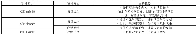 初中英语单元整体项目式教学以教材为依托,将核心教学内容融入项目式学习,构建起既紧扣教材、又关联学生生活实际的教学模式。这种模式以持续的项目探究为载体,以培养综合语 用能力为目标, 引导学生利用多元资源,通过自主学习、合作交流和探究发现解决现实问题,实现知识内化与能力构建。 结合教学 其实施可分为三个阶段。 一阶段是项目启动,教师以教材语篇为基础,围绕单元核心主题整合内容,创设贴近学生生活的真 习目标,分解设计每节课的子项目任务,为学生提供清晰的学习方向。 搭建学习支架,助力学生自主合作探究、创造性解决问题。以驱动性问 此外,提供公开展示平台,引导学生呈现成果,并通过多元评价与反馈促 生整理总结整个单元项目,反思学习得失,思考如何将所学知识和技能迁移到新情境 元整体项目式教学的实施流程如下表所示。