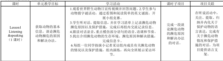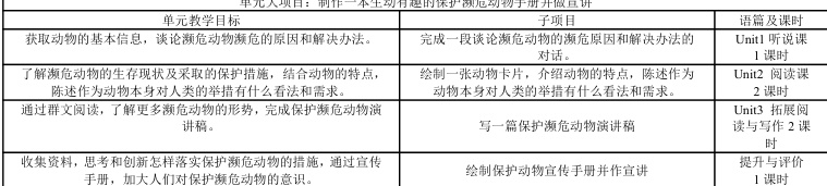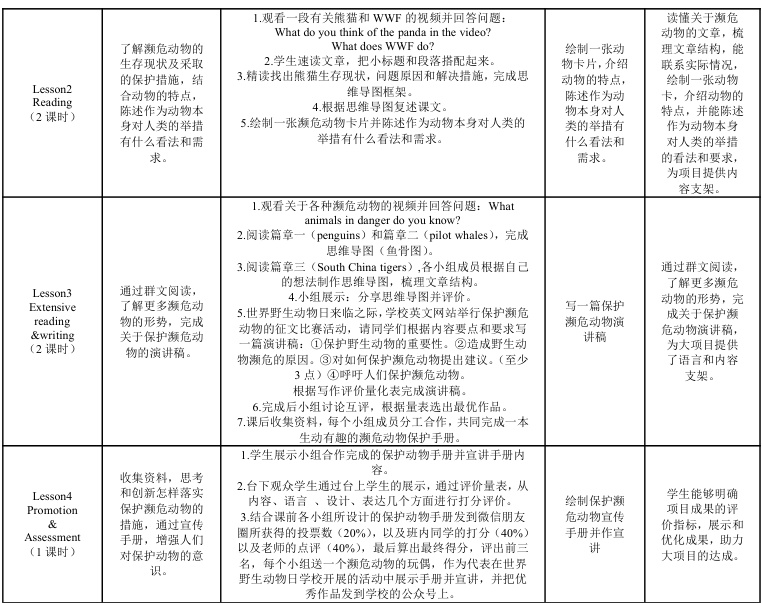 驱动性问题能激发学生学习热情,推动他们在真实情境中持续探索、解决问题,进而促进在语言实际应用的深度学习。教师需结合单元主题意义,挖掘贴合主题的内容,再联系学生学情与生活实际,构建任务系统,设计出连接学习目标与项目过程的驱动性问题,这类问题能引导学生主动探究知识、寻找解决方法,通过讨论、询 调查 最终生成完整解决方案。[3]结合本单元语境,确定驱动性问题为“Howcan we protect the animals in danger?”学生围绕这个问题探究时,会通过对教材语篇的理解、分析、应用和迁移,逐步深化对问题的认知,形成多样化项目成果。对八年级学生来说,这个问题既具挑战性,又能让他们将核心语言知识与实际应用结合,实现知识迁移拓展,极大激发学习兴趣和探究欲望。