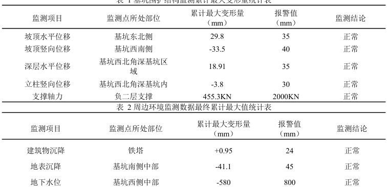 针对本工程主体基坑施工,对周边环境和工程自身进行了监测,各监测项均处于正常状态,累计最大值统计见下表。