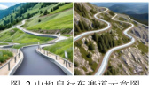 在南里渡周边建设一系列山地自行车道(如图2),根据不同难度等级进行设计,以满足游客多样化需求。车道将穿过多变的地形,在成本可控的前提下,将人为创意设计融入路面,打造一条“音乐彩虹自行车道”,将路面喷成彩虹色带,附以崔家坝镇 Logo 的涂鸦图案。通过精确计算并设置不同宽度和深度、间隔的凹槽,轮胎与路面的摩擦能够产生音乐旋律的效果,为骑行者提供丰富的骑行体验。