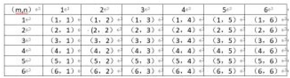通过这种表格形式,我们可以直观地看到所有可能的结果数量,从而更容易计算概率。例如,要计算两个骰子点数之和为7 的概率,可以直接从表格中数出所有符合条件的结果即样本点有 (1,6)、(2,5)、(3,4)、(4,3)、(5,2)、(6,1)7 个,然后计算其概率。