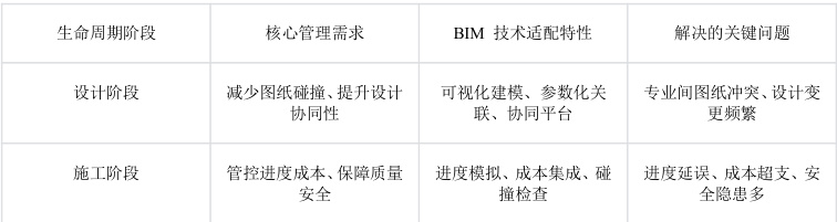 建筑工程全生命周期涵盖设计、施工、运维三个核心阶段,各阶段的管理需求与 BIM 技术特性高度契合,具体如下: