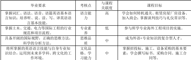 ESP 课程《通用工程英语听说》将核心素养融入编写理念,重构教学目标、考试目标,将课程目标与毕业要求挂钩,考核点正是英语核心素养四个维度:语言能力、文化品格、思维品质和学习能力。其毕业要求与课程目标关系如下: