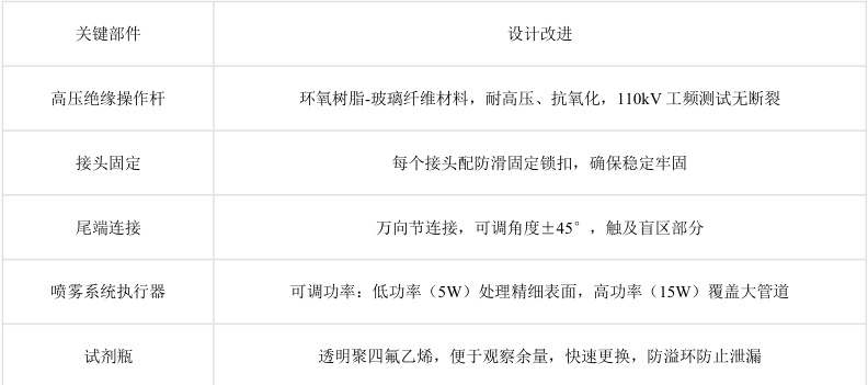 用环氧树脂-玻璃纤维组合材料制得高压绝缘操作杆,该材料耐高压、抗氧化老化,耐受工频高压测试结果为,在110kV 工频电压下持续60s,未出现断裂及短路现象。为保证稳定性和固定牢固,每个接头都设置防滑固定锁扣。尾端与喷雾装置通过万向节连接,可调角+/-45°,可轻松触及脊柱法兰后方的盲区部分。喷雾系统执行器选用可调功率,可选用低功率(5W),用于处理精细表面(比如橡胶垫接合处)以避免过多泡沫堆积,也可采用高功率(15W),用于大直径管道,确保完整覆盖。试剂瓶为透明聚四氟乙烯,方便观察试剂余量,转动约 30∘ 即可快速更换试剂瓶,配备防溢环,防止试剂泄漏,使设备受到污染。