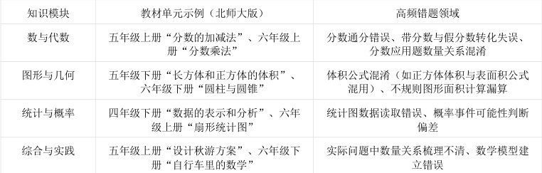 错题整理需结合北师大版教材的单元主题与知识体系,按“知识模块-错误类型”进行双层分类,确保资源的系统性与针对性。以北师大版中高年级教材为例,核心知识模块及对应高频错题领域如下: