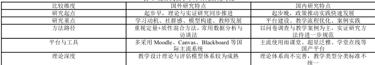 混合式教学(Blended Learning 或 Hybrid Learning)作为高等教育的重要教学模式,近年来在全球范围内受到广泛关注。尤其是在新冠疫情暴发之后,该模式作为应急教学的核心策略迅速普及,并在疫情后逐步转型为常态化教学形态,呈现出跨学科、多路径融合的发展趋势。国内外学术界围绕混合教学的概念界定、模型构建、教学实践与评估方法等方面展开了大量研究。我国对混合式教学的系统研究始于2010年前后,尤其在“教育信息化2.0”政策、“金课”建设以及疫情期间在线教学大规模推广的背景下,混合教学逐渐成为高校课程改革的重要方向。当前国内研究多聚焦于教学实践层面,关注教学平台的构建与使用、教师教学设计、学生学习体验以及翻转课堂的应用效果等。通过对比可以看出,如表1所示,当前国内外关于混合教学的研究在研究视角、方法路径与理论体系等方面存在一定差异。