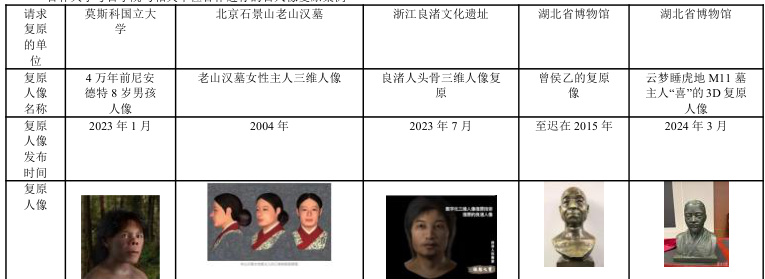 吉林大学考古学院方面,具体涉及朱泓、张全超、蔡大伟、崔银秋教授(生命科学学院)等,是一个跨院系的大团队,可与之接洽,讨论合作事宜。综合多个网络新闻报道,可知,吉林大学考古学院是国内考古文博领域最早从事数字化三维人像复原的,拥有亚洲最大的人类骨骼标本库,该团队的生物考古技术以生物人类学、疾病考古学、分子考古学为支撑,从 2002 年至今,20 余年间先后帮助北京石景山老山汉墓、浙江良渚遗址、曾侯乙墓、湖北省博物馆等多家文博单位进行数字化三维人像复原。2022 年 7 月又与俄罗斯莫斯科国立大学合作,帮助复原了一个4 万年前尼安德特 8 岁男孩人像,并于 2023 年1 月发布。2024 年 3 月,湖北省博物馆发布的云梦睡虎地 M11 墓主人“喜”的 3D 复原人像是其最新工作成果,涉及三维复原、3D 打印技术。社会反响都很好。