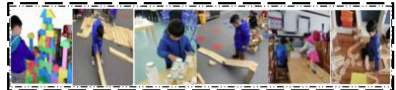 现在班级幼儿人数较多,仅凭教师一人进行各种观察难以做到全面,或个体有效观察。但是教师利用相机、录像设备,通过拍照、录像,可以进行间断性,连续性地捕捉幼儿在自然状态下的表现行为。教师再利用剪影APP 软件,对原始视频进行拼接、裁剪,再利用WPS 美篇,可以将图片、文字、视频整合为结构化文档,进行后续分析,为因材施教提供依据。下面是教师用视频记录军军玩建构游戏的情景(节选)。第一幅图是军军早上自主搭建情景。第二幅是集体活动军军自主搭建小木桥。第三幅图是军军垒叠杯子游戏。第四、五幅图是军军搭建滑滑梯和观察同伴搭建的情景,第六幅图是军军拼建龙车情景。画面显示军军认真专注,在思考问题,观察他人建构也很认真,表明军军是一个聪明好学的孩子,拥有较好的学习品质。