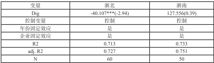 浙北(杭州、嘉兴等 6 市)Dig 系数 -40.107 在 1% 水平上显著,减排作用显著:杭州以数字产业集群带动转型,嘉、湖承接溢出优化能源结构。浙南(温州、台州等5 市)Dig 系数 127.556 不显著:数字经济水平低,技术应用少,传统产业改造不足,减排作用未显现。