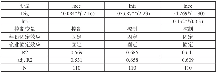 数字经济与技术创新显著正相关。加入技术创新后,Dig 系数变为 - 54.269 在 5% 水平上 显著,lnti 系数 0.132,中介效应占比35.46% ,验证技术创新的关键中介作用