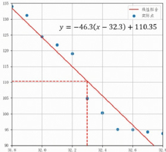 加水量对于来料水分的线性拟合( (p=-46.3,x0=32.3,b=110.35) )