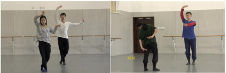 对民族民间舞素材的重解,指将原来的民间舞蹈素材进行细致地拆解。如按身体动作拆解,则可分为四肢动作、躯干动作和头部动作,或上身动作、步伐动作,又或者再细分到手指、肘、膝、踝等关节的活动等。如按生活动作拆解,则可分为行走中的动作、倚坐时的动作、劳作中的动作等。例如北京舞蹈学院编导系 2011 级新疆班的编舞技法课中就有重解动作这一训练环节,他们以维吾尔族舞蹈动作为基础素材,将其重解为上身动作和下身动作,在训练中两两一组,一人做动作原型,另一人将原型重解后以其他形态表现出来。如图1 保留了下半身动作,改变了上肢的动作形态;图 2 保留了维族的手型,改变了动作朝向和躯干动作。由此可见,即使编导们对动作素材进行了重解,但还是能够从变形的动作中看到动作原型中的元素。因此,在重解民族舞蹈素材时可以先采取局部重解的方法,对舞蹈中的最小单位进行拆分。