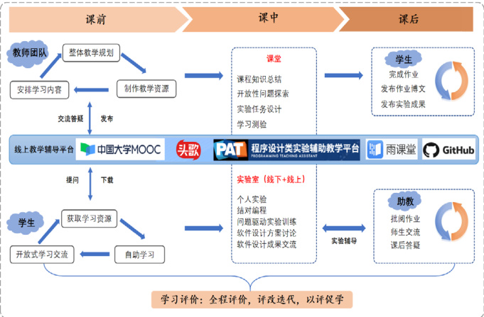 线上发布实验任务和指导资料,线下开展实验室操作、结对编程等活动;通过 GitHub 等平台实现项目协作与成果展示,教师在线监控并解决实践中的问题。