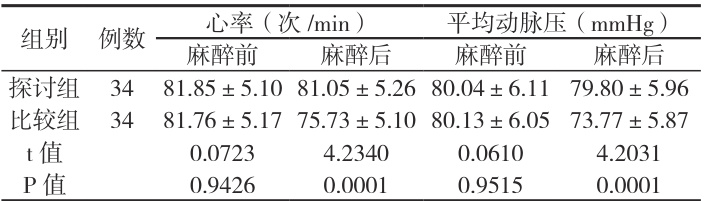 如表 2 所示,麻醉前差异不明显, P>0.05 ;麻醉后,探讨组生命体征相比于比较组较为稳定, P<0.05 。